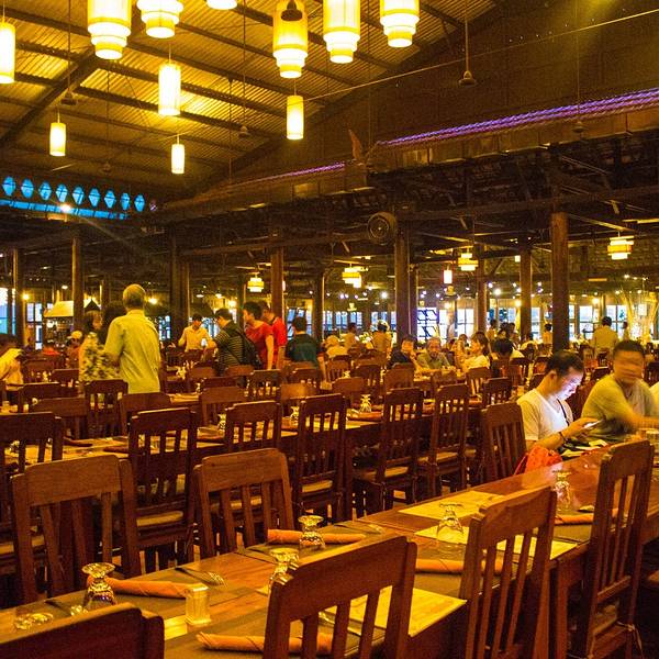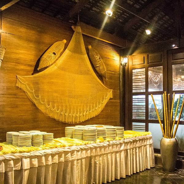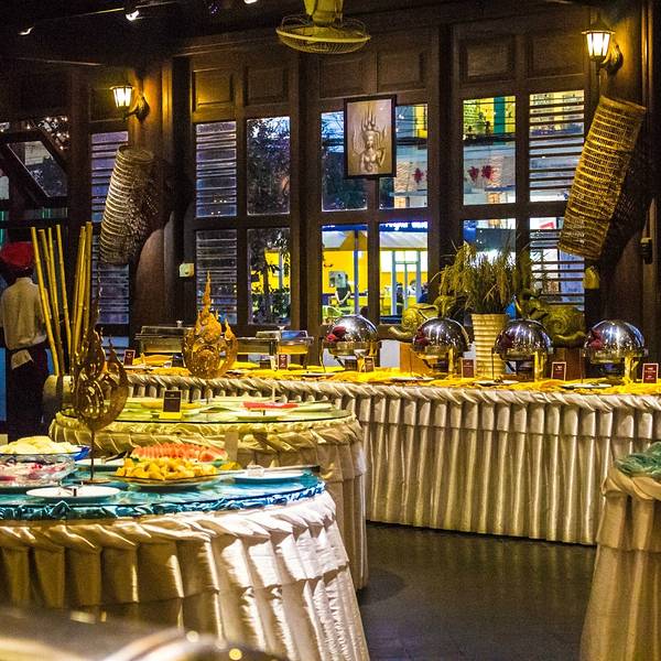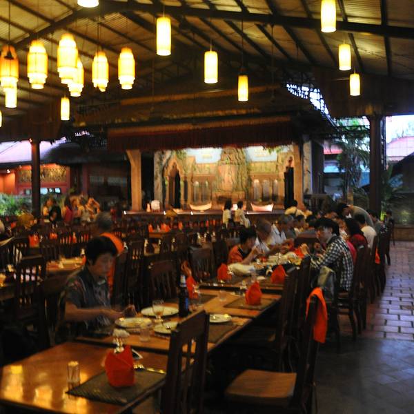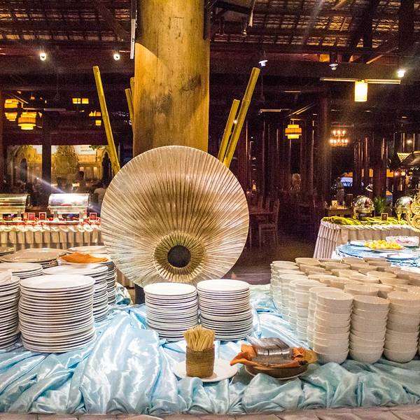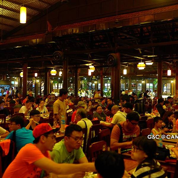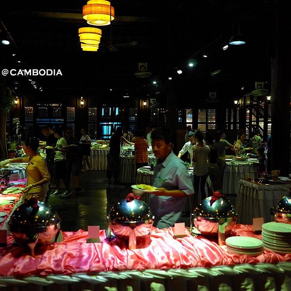 餐厅在暹粒大型购物商场Lucky Mall的对面,这家有10多年经营历史的餐厅据说是暹粒最大的自助餐厅,进餐同时可以欣赏到传统高棉舞蹈表演。自助餐的品种包括传统高棉菜和西餐等。餐厅很大可以容纳650人同时用餐,装修采用全实木,营造出一种热带雨林风格。我们去的有点早,一开始整个餐厅几乎是空的,等表演快开始的时候呼啦啦一下来了很多人,我估计是旅游团定点的餐厅。