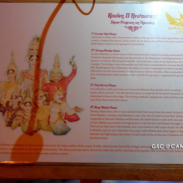 坐车回到市中心,来到位于Sivatha Street 的Koulen restaurant,和阿东就此分别,饭店规模很大,绝对有几百张桌子,阿东给我们提前预定的桌子比较靠前,视角不错。餐食还算丰富,味道只能说尚可,就没有专门给各位看官推荐,舞蹈大概有7个节目。从椰子壳舞,到金鱼美女和猴子舞,还有各种看似奇特的舞蹈,也算是领略下异域文化,照我爹地的话来讲,这些舞蹈,尤其是那些传统舞蹈,几本就是一个妹子走来走去,手翻来翻去,木有表情,然后就没有然后了…神点评,让我无言以对,不过,妹子颜值还是不错的,可以养养眼。需要特别指出的是,在金边的国家博物馆,我们看到了更赞的演出,所以这里就没有特别推荐了。
