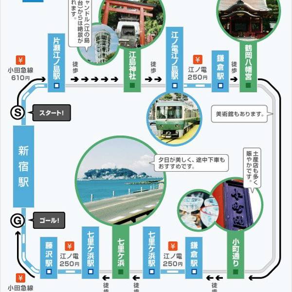包含了新宿往返藤泽(55分钟左右)或者片濑江之岛(65分钟左右)的小田急费用,以及镰仓境内藤泽——江之岛——镰仓站一线的江之电费用。但其...介绍一下东京前往镰仓的交通方式: