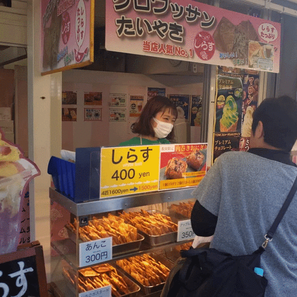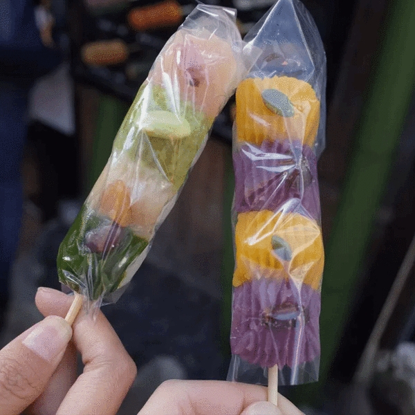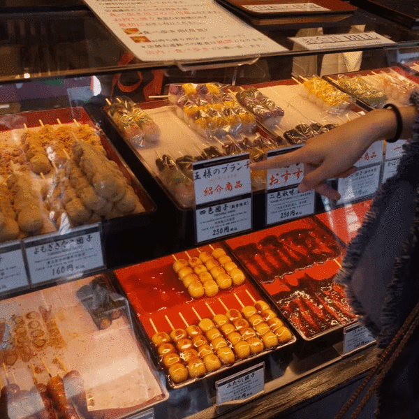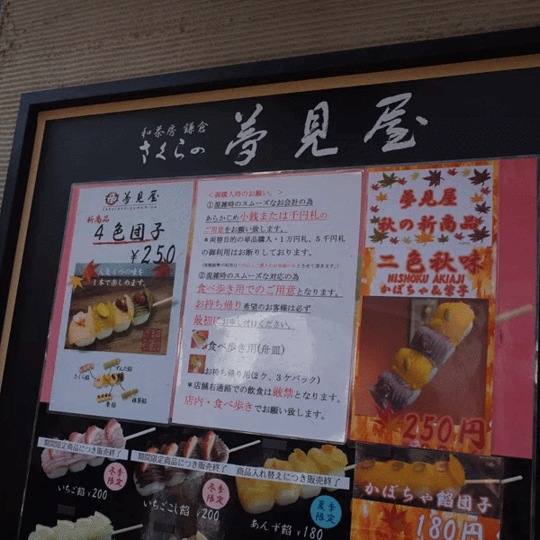这里有个景点——八幡宫(我们没有去,就不多说了),说说吃的!我们去了小町街,街上吃的太多了,打算在镰仓待一天的人可以来这里解决午餐或者晚餐或者吃个下午茶。到了日本必须吃个团子!我们去的这家店叫“梦见屋”,门口有很多人在排队,我们就心动了👇团子长得都很可爱,价格也不贵,喜欢糯米类食物的朋友们可以一试!我点的二色秋味,朋友点的四色团子,都挺好吃的,就是太!甜!了!建议大家在店旁边吃完再走,不然竹签没地儿扔,毕竟日本的垃圾桶真的太少了,我们是吃完才想起这个事儿,我朋友说怪不得大家都要在店旁边吃完再走哈哈哈哈哈下面这家店我们真的是闻着香味去的,门口也排了长队,我们决定相信大众的口味品尝一下!