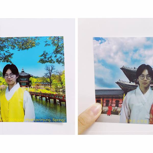 今天是期待已久的韩服体验,我们坐地铁前往。韩服体验展会馆在BEXCO。 开馆时间:10:00—17:00(12:00-13:00午休),每周一和1月1日闭馆。 交通:地铁2号线centum city(bexco)1号口出,步行5分钟,Auditorium1楼后面。 公交:115/63/40/5/155/141/181/39/1001/1007/1002号,centum city(bexco)停靠,步行5分钟。刚进门,就看见两个小姐姐,有一个会简单的中文,和我们大致介绍了一下韩服。然后我们可以穿韩服在机器上拍照,站在一块绿幕前,选择韩国的各种景点当背景,有点像小时候的大头贴。一张1000韩币,我们换了两套衣服拍了两张作为纪念。乔治说他站在我身边,像我的仆人,哈哈哈。之后小姐姐帮我们穿上另外的韩服,可以在房间内任意拍照。这个体验馆是一个很小的屋子,虽然小姐姐说我们可以去外面拍照,但是外面的建筑太现代化,不如体验馆里面拍。 乔治的帽子让他长高了10厘米,非常搞笑。小姐姐说,乔治的帽子是室内戴的,而我们经常在韩剧看到的,也就是模特头上的是室外戴的。