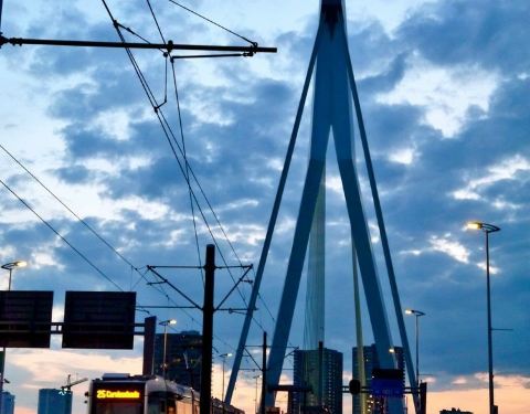 ...部和北部的一座最重要的交通桥梁了,大桥通体都是白色的,不管是白天和晚上都非常的漂亮,车流量很大这座大桥是连接鹿特丹这座城市南部和北部的一座最重要的交通桥梁了,大桥通体都是白色的,不管是白天和晚上都非常的漂亮,车流量很大。