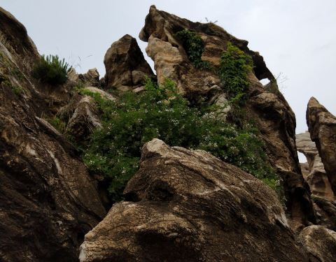 溶蚀作用形成的孤岛状残丘造型奇特,倾斜的陡崖和一线天峡谷纵横交错。