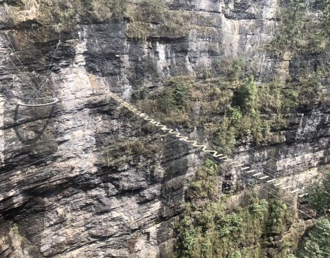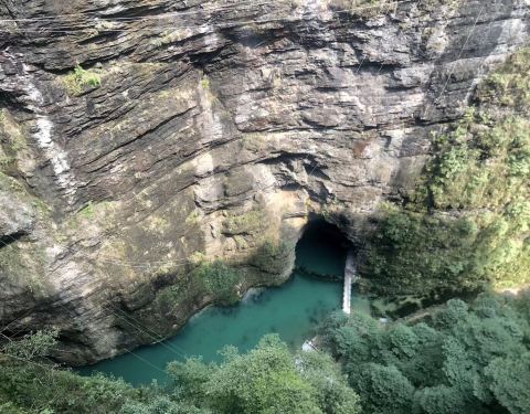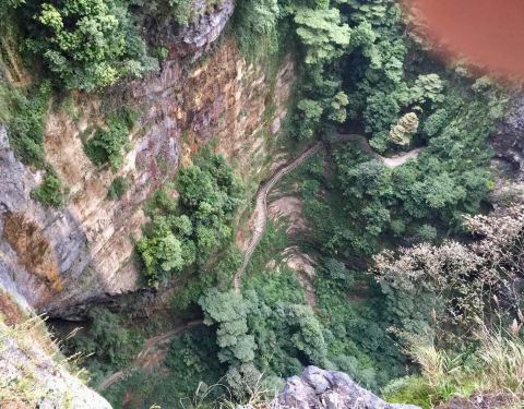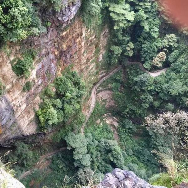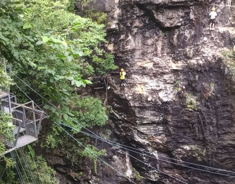 猴儿天坑,勇者大冒险的圣地。我带着女儿是奔着抖音超级大秋千去的,可是到了那里退缩了,首先,我是不敢!胆大的女儿也选择了放弃!为不枉此行,女儿选择了攀岩行走项目!在教练得带领下出发了,顺着岩壁下行,行走隔板吊桥至对面的崖壁之上,下面是百余尺绝壁深潭!我开始后悔了,毕竟女儿才十二岁。我担心她承受不了恐惧而放弃!大概四、五十分钟后安全返回!我悬着的心才安稳!“害怕吗?”我问,女儿回答“不怕,有安全绳”。这时,在山涧中又传来了嘶吼声,我和女儿相视一笑,抬头看去,又有一个人荡在在超级大秋千上!哈哈!