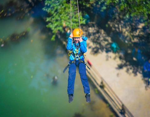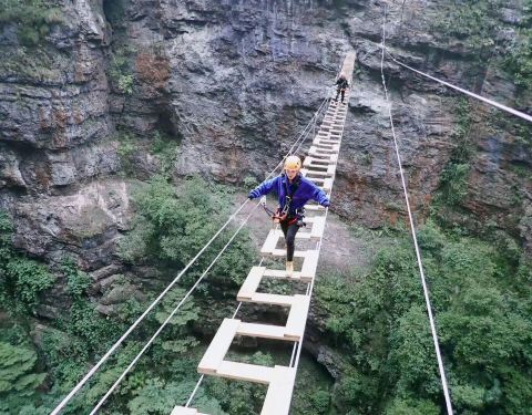 猴儿天坑,勇者大冒险的圣地。我带着女儿是奔着抖音超级大秋千去的,可是到了那里退缩了,首先,我是不敢猴儿天坑,勇者大冒险的圣地。我带着女儿是奔着抖音超级大秋千去的,可是到了那里退缩了,首先,我是不敢!胆大的女儿也选择了放弃!为不枉此行,女儿选择了攀岩行走项目!在教练得带领下出发了,顺着岩壁下行,...猴儿天坑,勇者大冒险的圣地。我带着女儿是奔着抖音超级大秋千去的,可是到了那里退缩了,首先,我是不敢!胆大的女儿也选择了放弃!为不枉此行,女儿选择了攀岩行走项目!在教练得带领下出发了,顺着岩壁下行,行走隔板吊桥至对面的崖壁之上,下面是百余尺绝壁深潭!我开始后悔了,毕竟女儿才十二岁。我担心她承受不了恐惧而放弃!大概四、五十分钟后安全返回!我悬着的心才安稳!“害怕吗?”我问,女儿回答“不怕,有安全绳”。这时,在山涧中又传来了嘶吼声,我和女儿相视一笑,抬头看去,又有一个人荡在在超级大秋千上!哈哈! 展开