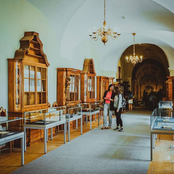 图书馆大厅的穹顶上的壁画是18世纪的著名的画家的作品,还有一个展览厅,里面展示有一些古籍很大很漂亮的一个修道院图书馆,这个图书馆修建于12世纪。图书馆大厅的穹顶上的壁画是18世纪的著名的画家的作品,还有一个展览厅,里面展示有一些古籍。