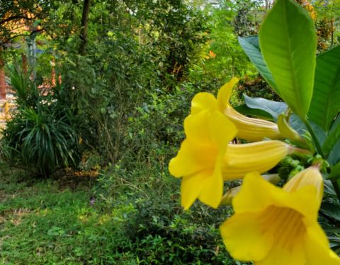 免费的景点,里边是花香鸟语,黄蝉花、栀子花、巴西野玫瑰,游人悠闲自得,惬意的生活。