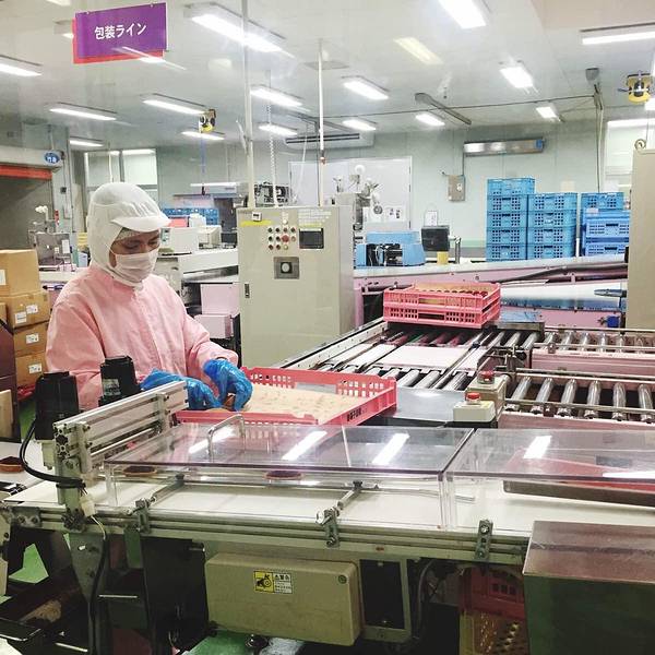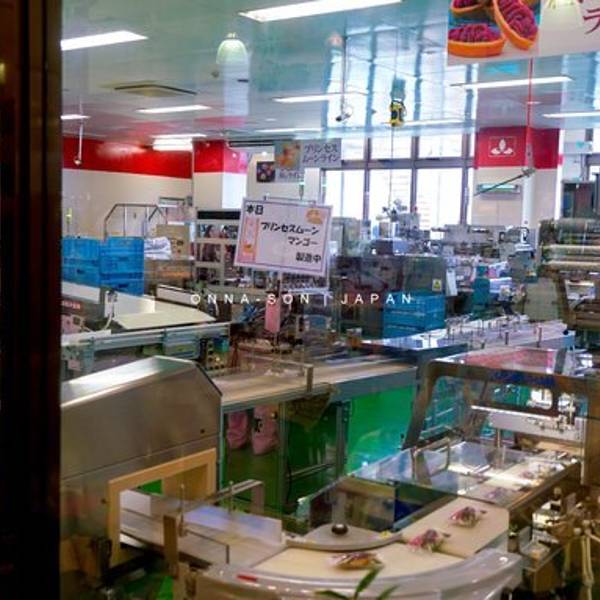 点心制作工场。很干净是不是?儿子看着很感兴趣。御菓子御殿工场店。花笠造型的门厅。点心制作工场。很干净是不是?儿子看着很感兴趣。