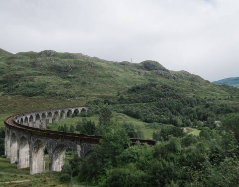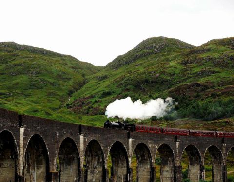 乘坐从马莱格到威廉堡的火车或Jacobite蒸汽火车头途中经过。
