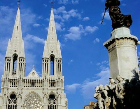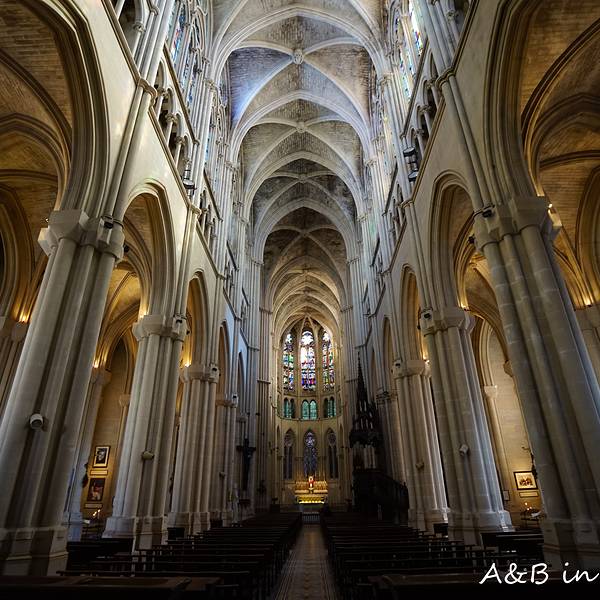 典型的哥特式教堂建筑,两座高耸入云的尖塔极其醒目,在蓝天映衬下很有气势典型的哥特式教堂建筑,两座高耸入云的尖塔极其醒目,在蓝天映衬下很有气势。教堂的青铜一人门、彩色玻璃都很有特点,教堂地处交通要道,门前有轨电机来来往往,还有一个公众集会的广场。