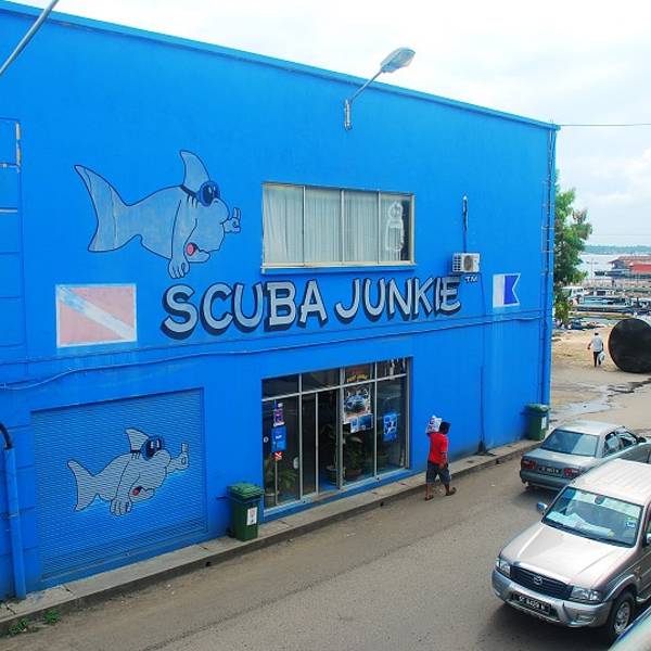 在一路闲聊中,仙本那也就到了,一个拥挤(进镇子的时候还堵车了)、热闹、有些地方还显得比较肮脏的小镇。司机将我们放在Scuba Junkie的门口,收了每人25马币的车费。看来人多是会便宜,和Scuba Junkie预约接机的时候,还说每人要45马币呢。 车停潜店门口,别人都去check in了,某猪居然急吼吼地把我拖去旁边的便利店购物!说是阳光太晒了,她迫不及待要去买防晒霜。后来重回仙本那的那个晚上,她又发现这里的万宁、屈臣氏价格比国内便宜很多,放着海鲜大餐不吃,不厌其烦地逛这些小店,真是服了女人的购物欲啊。 好不容易等她弄完,我才正式进入Scuba Junkie。当初在选择行程的时候,纠结了很久。我想学OW并加fun dive,阿猪对本次旅行的期待铁定是碧海沙滩。虽然仙本那住宿便宜、美食选择多,但环境就差了点。到了这里之后,我也的确发现这里地上的垃圾挺多,近岸的海水不好看,与想象中风情海边小镇想去甚远,顿时庆幸当初选择去离岸小岛度假。至于马布岛上的住宿及潜水选择,Scuba Junkie是以教学严格、潜水专业、住宿性价比高以及伙食难吃而著名的。权衡之下,我选择了这家,后来也十分庆幸当初的决定。 Scuba Junkie的接待中心挺大,落地玻璃透过热带阳光照射地室内十分明亮。几个工作人员在为游客做着行程的确认,三三两两的潜水客散落在沙发区,气氛挺好。接待我们的是一个英国口音浓重的姑娘,耐心细致。我们核对了在岛上预定的每一项支出,提出了一些更改的要求(比如调整阿猪DSD的时间以及浮潜的次数,为的就是能被安排和我一条船出海)也很友善地得到了满足,最后现金结账了事(划信用卡要3%的手续费哦,这点在马来西亚很多地方都是)。然后,就是觅食、取钱和办电话卡的事儿了。