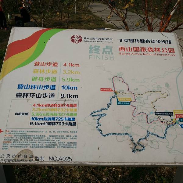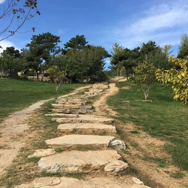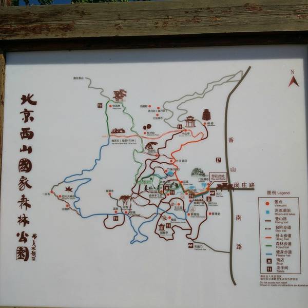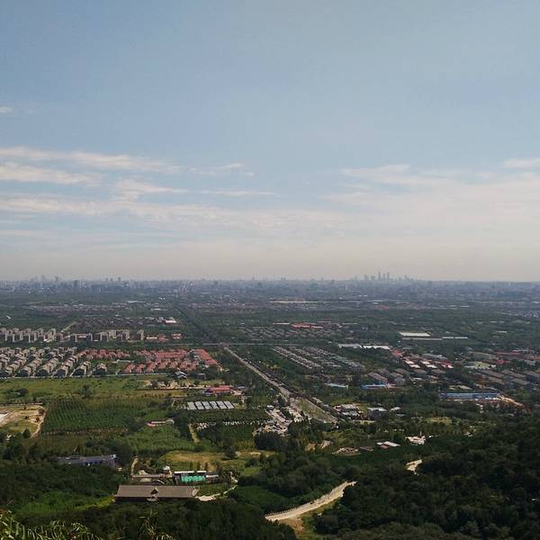 第一次游玩下山沿着红色线路的台阶下山,真的好多级,想想如果爬上去会很累吧,登山爱好者的选择;第二次下山沿着最下方最大圈的蓝色线路走的,是一条能走汽车的水泥路,很无趣,也很晒,不管是上山还是下山,都不推荐此条线路,建议一般人群还是走绿色线路。第二次去的时候天气特别特别好,真的可以望到很远,可以看见颐和园、盘古大观、国贸和中央电视塔,手机像素渣哈哈哈!