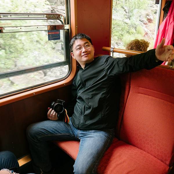 观光火车行进在山林之间,时而穿越有原木护栏的桥梁、时而像汽车一样盘山而行。