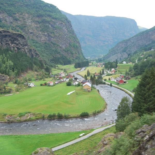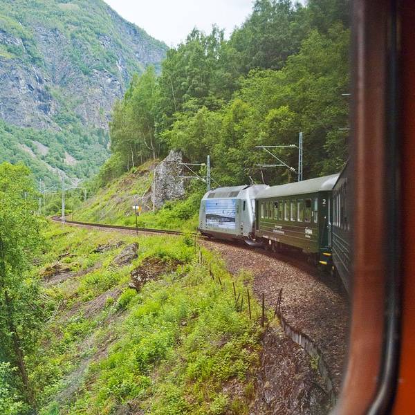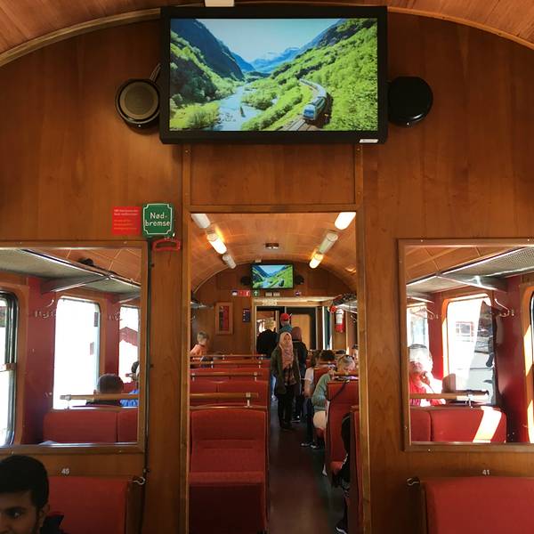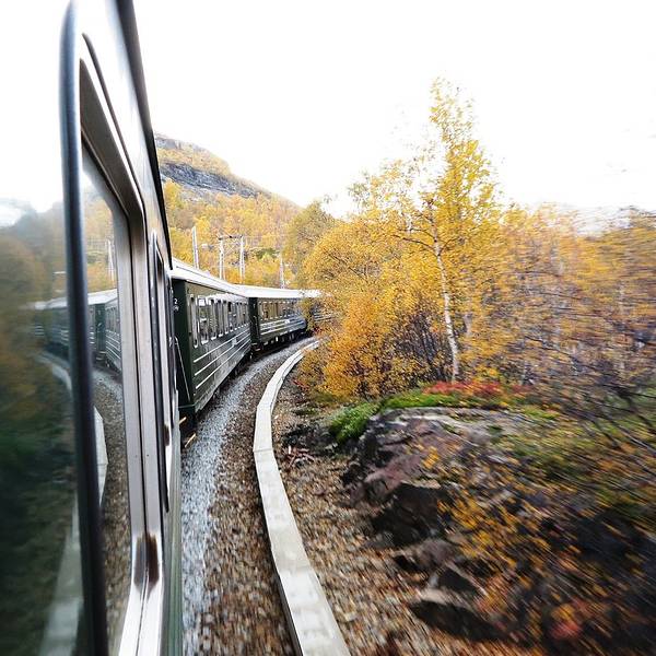 弗洛姆高山铁路,垂直落差800多米,沿途可在车上欣赏山间小屋和不时闪现的瀑布,那些萦绕于河流之间的山谷小屋,着实有如童话仙境一般。很有英伦风格的火车车厢火车缓缓启动,...午饭后继续挪威缩影的下半段旅程: