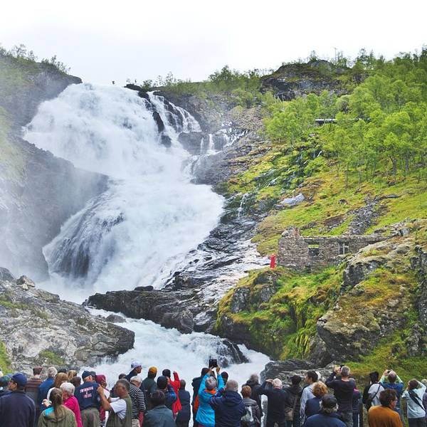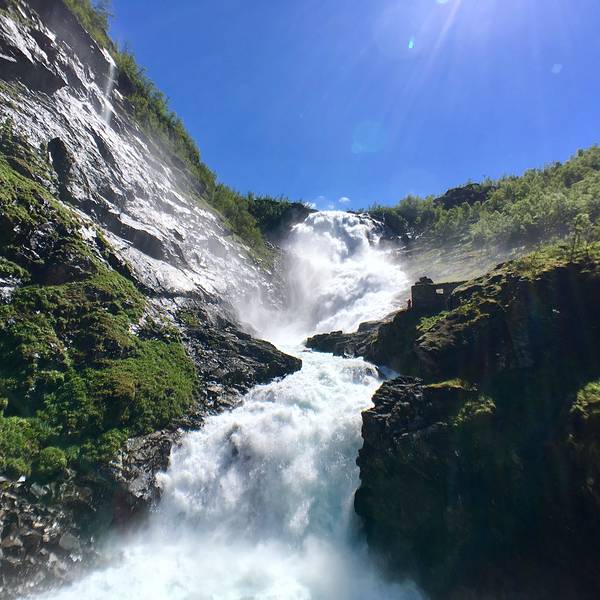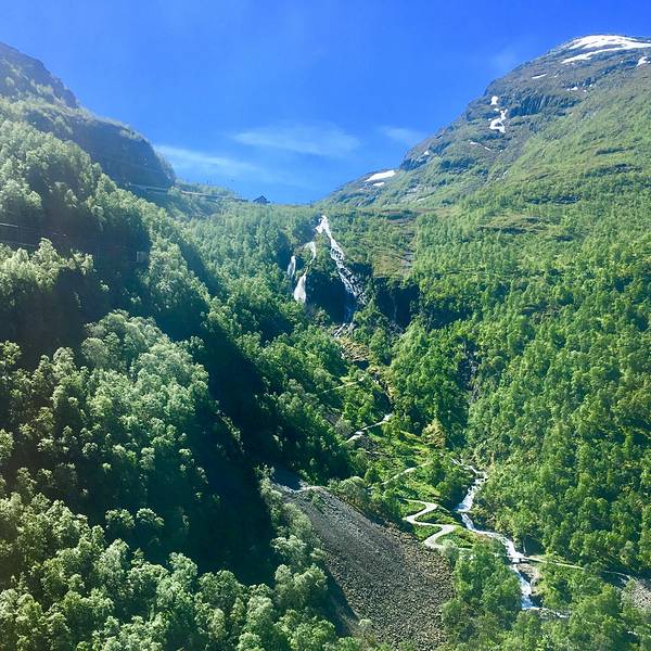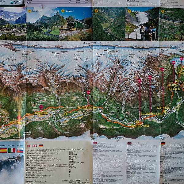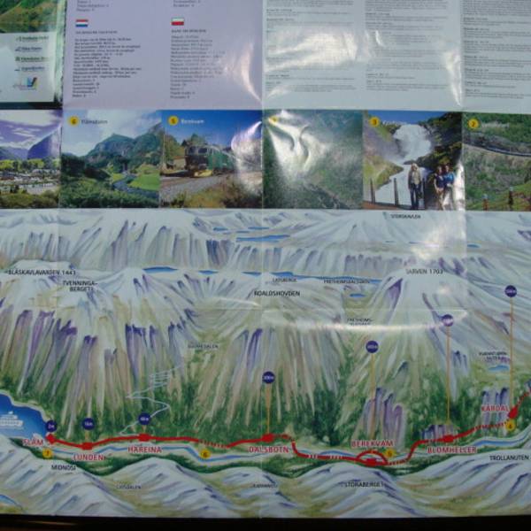 费洛姆铁路全长20公里,号称是铁路工程的奇迹,斜坡坡度大约为1:18,通过修建20多条隧道,将运行海拔提高到864米。是世界上最陡峭的铁路,行驶中没有缆绳或闸轮,全程45分钟,途经壮观的瀑布群(在Kjosfossen可以下车拍照)。