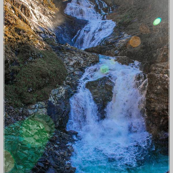 可以看到穿过深邃沟壑的河流、垂挂在陡坡上的瀑布、白雪皑皑的山峦和陡坡上一片接一片的山地牧场。