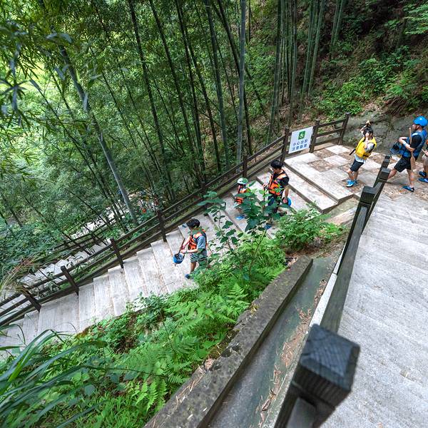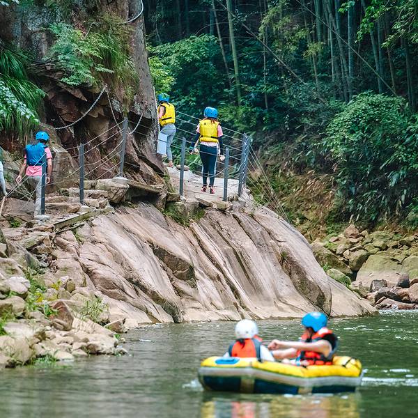 必打卡二:溪水边徒步--溯溪溯溪,River Tracing,是由峡谷溪流的下游向上游,克服地形上各处障碍的一项探险活动。这一项源自日本的时尚轻户外体验,近年来颇受户外旅游爱好者喜爱,尤其炎热酷暑之下,置身峡谷竹海,白天几乎很少暴露在太阳直射之下,既能近距离亲触大自然,领略风景,酣畅淋漓又能加速人体新陈代谢,锻炼身体和意志,并且峡湾迷人,一步一景,非常好。人在景中,景在眼中。来体验清凉湿身的人们,内心首先非常喜欢大自然原野峡谷的环境,其次才是漂流。所以不妨体验一下这短暂的20分钟溯溪体验。目前安吉仙龙峡,也是浙江首家溯溪漂流景区。