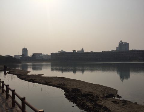 ...粼粼,很美,吃完早饭出来沿着湖边的栈道逛逛,三个成品字形的仿古建筑立在湖畔,很有开封古城的韵味
