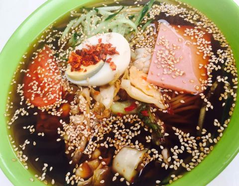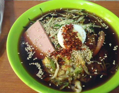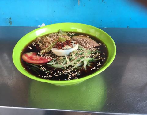 艾玛~一打开这家店看刚好一年前也是六月底去台东看排队就没吃。。 这回补上补上~ 在长兴路松和路一号对面~ 每次来都是大长队~ 尤其天热来一碗冷面~ 也是排了二十分钟?~ 要了个荞麦面的~ 朝鲜冷面就是酸酸酸甜...艾玛~一打开这家店看刚好一年前也是六月底去台东看排队就没吃。。 这回补上补上~ 在长兴路松和路一号对面~ 每次来都是大长队~ 尤其天热来一碗冷面~ 也是排了二十分钟?~ 要了个荞麦面的~ 朝鲜冷面就是酸酸酸甜口~ 黄瓜丝泡菜~西红柿鸡蛋~ 本来应该是牛肉片。。 不过低配版本就是午餐肉片啦~ 荞麦面比较q~ 上面撒的满满的芝麻~特别香~ 我们吃完月光传奇才来的。。 所以有点吃不动了。。 应该饭前先来一碗开开胃的哈哈哈哈!~ 有桌椅座位~ 服务生收拾的特别及时~赞赞的~