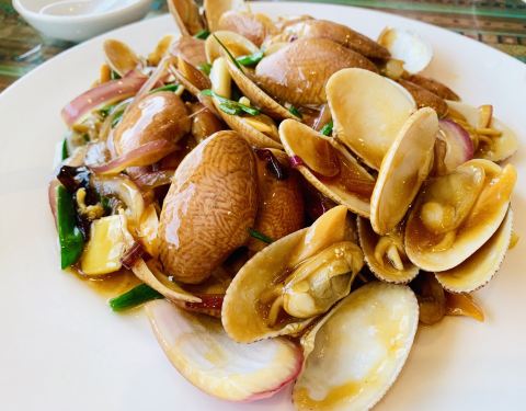 提前联系店家可约到附近酒店车接车送,亚特兰蒂斯过去10分钟以内。晚上6:00不到的时候店里没有坐满,窗边落坐,店家热情招呼,皮皮虾似乎每桌必点,入味多吃几个有点咸;扇贝是略桔红的硬壳,个头不大味道不错;最好吃那盘蛤蜊,鲜咸适中、肉质细嫩。