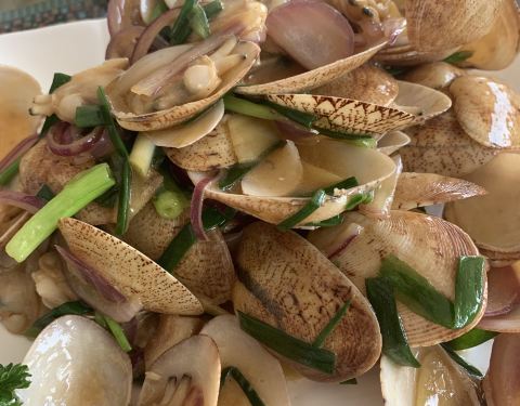 最好吃那盘蛤蜊,鲜咸适中、肉质细嫩。扇贝是略桔红的硬壳,个头不大味道不错