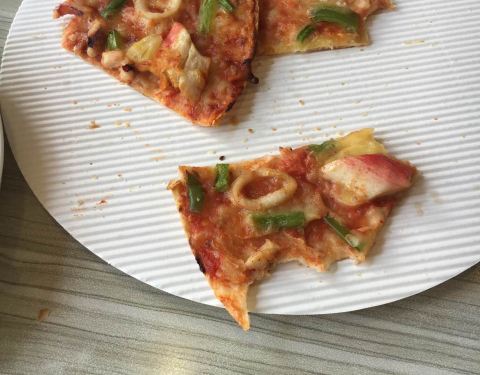 新款榴莲撩海鲜薄脆披萨还不错,适合三人享用(因为还要点别的,不然太撑,