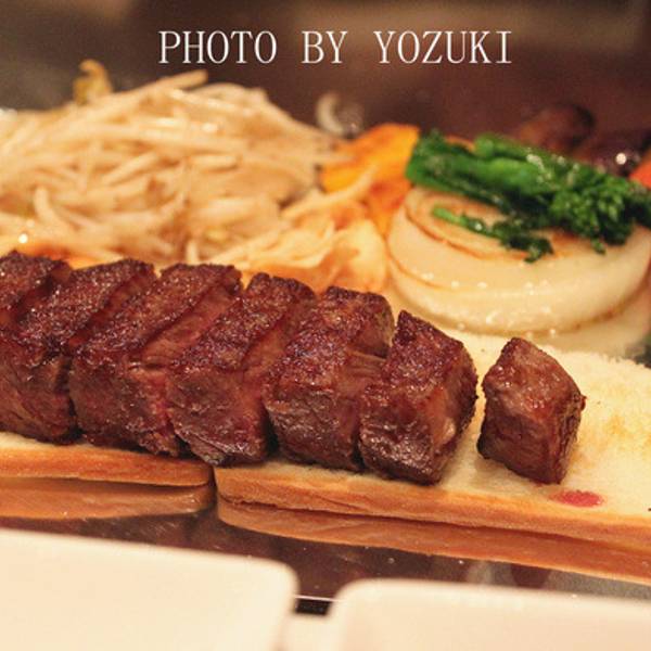 这家和牛店,客人是围坐在桌边,专门的料理师傅在中间大展手艺,可以目睹和牛由生变熟的真个过程。前菜,一道生牛肉,小小五片,意犹未尽啊!不愧是听着音乐长大的神户牛,生牛肉也不腥,凉凉的滑入喉咙口。吃完前菜,师傅就会从一侧出来,端上一盘点的生牛肉,200g差不多比手掌大些,2cm厚度。倒油,把蒜炒的香脆放在一边,再将茄子,胡萝卜,洋葱圈等炒到外层微焦,取面包片放在两侧,一面变黄后放在面前的锡纸上,别的食材一一堆放。面包片会把和牛多余的油吸掉,以至于吃起来不会油腻。8分熟状态下的和牛,里层还是微红的,看得到纹路,外层早就微微焦,吃到嘴里,就有2层体验。咸淡适中,可以直接吃,蘸着牛肉酱吃也非常美味啊。 最后,才把和牛放在台面上烤,要的8分熟。