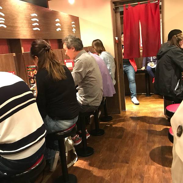 起源于九州,是博多拉面的一种,也是当地豚骨拉面的代表,蔡澜强力推荐的一家拉面店,在店里可以经常撞见明星哦。这里拥有“一个人也可以吃拉面”和“专心吃面”的拉面文化,与众不同的小隔间设计,你在帘子这头吃面,厨师在另一头制作拉面,私密性很好,单身人士就餐的福地。 备有各种语言的菜单,上面分类详细到拉面的份量、软硬程度、汤底浓度等等,十分贴心。每个人的桌子上有杯子,可以自助接水。这里的拉面汤头浓郁,面身筋道,吃完拉面一定要大口喝掉汤,碗底会有惊喜。