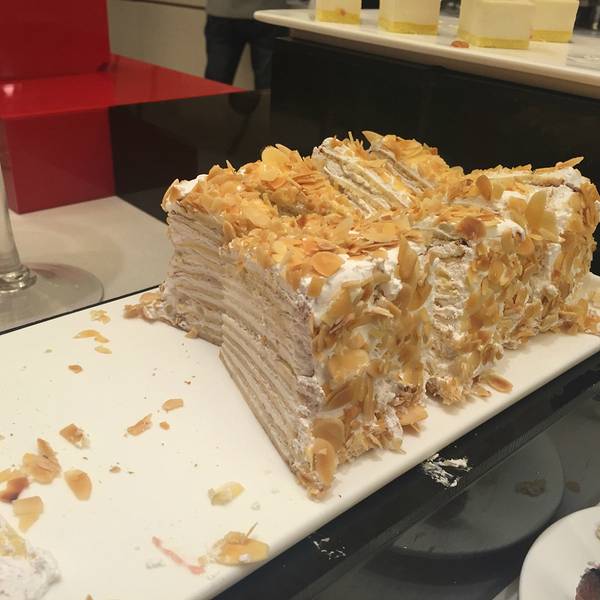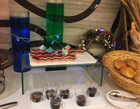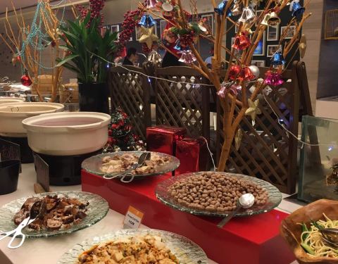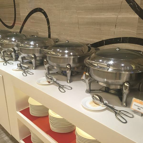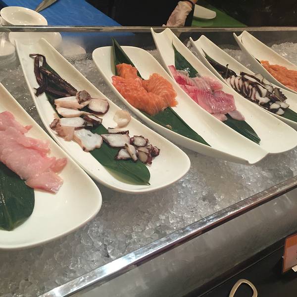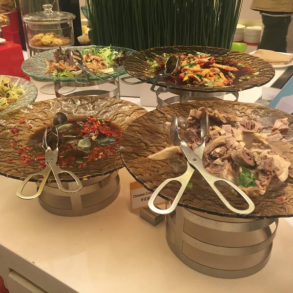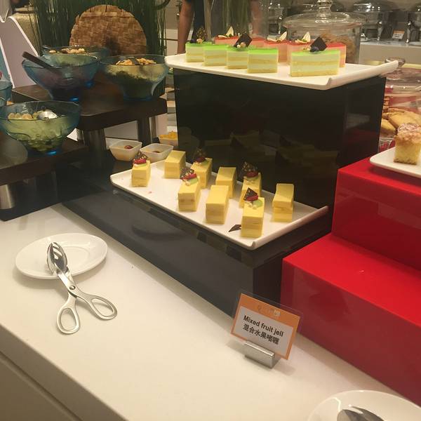 餐厅环境很好,座位不是很多,基本上是满座,比较安静。菜品不是特别丰富但该有的基本上都有了,而且中餐、西餐、日韩料理都有,种类比较齐全。这个长的像小酒壶的东西里装的竟然是汤品,造型很美,顶上是小碗保温。还有这个很漂亮的盅,里面是海鲜汤,味道很鲜,放了鲜虾、蛤蜊等海产品,就是稍微有点咸。朋友一上来就端来了刺身,话说切的有点略厚,对我这种本来就不喜生食的人来讲就是种折磨,不过尝了一小块觉得还蛮好的,没有很浓烈的腥味。沙拉有自己拌的也有已经调制好的总厨沙拉,味道一般。热菜全部加盖保温起来的,基本上都是中餐类的炒菜和炖品之类的,味道不错。奶油龙利鱼很好吃,软软的,口感很好。这个季节还不是吃螃蟹的时候,这个应该是梭子蟹一类的,肉不是很饱满。华夫饼和甜筒卷,吃冰激凌必备的,但是他家的冰激凌真的不敢恭维,不知道是冷冻装置出了问题还是本身就如此,冰激凌基本上化成水了,特别稀,只能用小盅盛来吃了,味道当然不会好到哪里去。他家有很多造型霸气的面包,不过来吃自助应该很少有人吃面包这种饱腹感极强的吧,看它更像是摆设。他家的明星产品就是这个榴莲千层了,基本上每桌必备,榴莲的味道不是特别重,基本上一端出来就被拿光了,拿出来之前是冷冻的,导致放了很久之后榴莲还是冻住的状态,大大影响了口感,不过我还是吃了两大块,榴莲是我的大爱啊。总的来说他家的自助比较一般吧,菜品种类中等,味道尚可,比较推荐的有牛排,奶油龙利鱼还有榴莲千层,其它的感觉一般般。