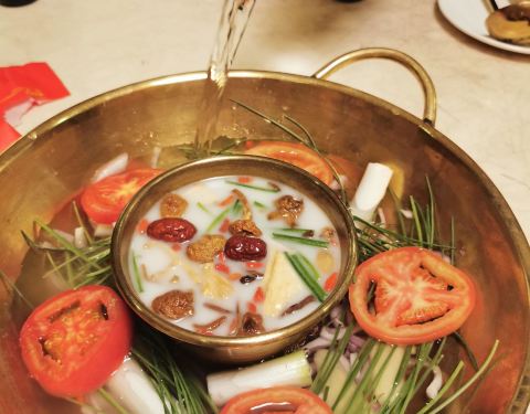 - 这家的菜品还不错,冬天当然要吃羊蝎子火锅啦,味道不错,羊蝎子上的肉很嫩,很好吃
