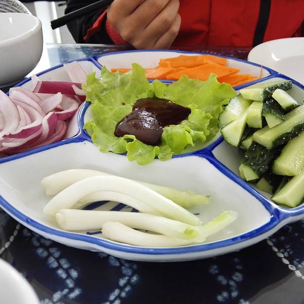 - 胡萝卜,黄瓜四样菜,蘸大酱吃,特别清口,我和女友都超级爱吃,中间酱蘸完了,还跟老板说,让老板加点酱呢实用