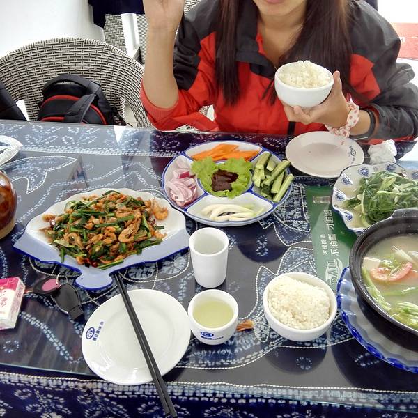 大理游玩的时候,租了一辆电动车,环湖玩了两天,可惜天公不作美,一直下雨来着,直到最后一天走,天气都是蒙蒙雨,最后走的那天,在环湖西路看到了这家店,就进来了,一是考虑避避雨,二是确实也到饭店了,进来吃点饭! 进门以后饭点还没有什么客人,中午十一点左右的样子,服务员们正在吃饭,一看来客人了,立马有一个年轻漂亮的女老板过来招呼我们,问他家有没有团购,他说点评网有双人套餐,打开链接看了看,确实很实惠,于是就对老板说就这样吧,要个双人套餐! 等菜的时候就连上他家wifi玩一玩,信号不错,不一会儿菜就上全了,当然人也越来越多,我俩来的时候一个人没有,现在需要等位置了。 双人套餐主要有:韭菜炒河虾,砂锅杂菜,四季丰收,素炒时疏,以及两碗米饭!就是环湖西路边上,过了富美邑村接着走走就到了!味道真的不错,价格也合理,饭点人会很多,周边就他家一家饭点,比较好找,推荐!