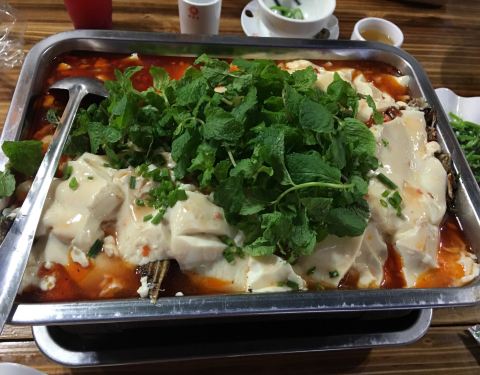 在荔波的第二晚依旧去了樟江美食街觅食。第一晚吃的好好吃无烟烧烤觉得性价比一般,因此看门口坐着的人气果断换了这家店。这次挑了一条两斤多的小七孔青鱼做豆花鱼,价格在一百五十几元。鱼身上铺了很多豆花,还...