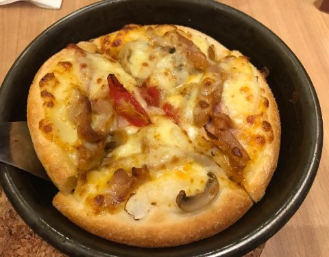每逢周一就按耐不住想去必胜客消费一把,毕竟是它家的会员日。位于高架南段又一城的必胜客是我们同事逛吃的第一选择,毕竟高架来回都是特别方便的。中午又到它家消费一把,点了双人套餐,带有浓郁番茄口感、饼面...每逢周一就按耐不住想去必胜客消费一把,毕竟是它家的会员日。位于高架南段又一城的必胜客是我们同事逛吃的第一选择,毕竟高架来回都是特别方便的。中午又到它家消费一把,点了双人套餐,带有浓郁番茄口感、饼面厚实的美式披萨成了最爱。这款披萨虽然比较常规,但满满的腊肠肉以及上下两层的芝士还是叫人爱不释口的。 点心选了虾球,外脆里嫩,也是非常过瘾的。蛋糕选了巧克力的,里面还有内心巧克力酱,给人满足感。饮品方面点了一杯青柠饮还有一杯自己最爱的黑天使,加上之前办会员充值赠送的芝士蛋糕,两个人傻傻吃到撑。总体还是非常满意的。