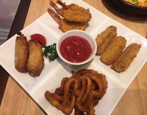 - 2个人点了榴莲海鲜拼的薄饼披萨,还有4宫格饮料,真很棒,味道很好,量也多,2个人吃的很撑,5星好评咯
