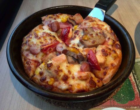入口在联达人人乐超市大门的右手边,吃饭的地方一般在二楼,一楼用于迎客、等位的。店内环境看着还是比较干净、整洁的,大桌、小桌都有。本来必胜客的环境比较适合闺蜜和情侣,这家虽然环境不错,但座位之间有点挤,还不是很私密,感觉有点向快餐发展的样子,不太喜欢。