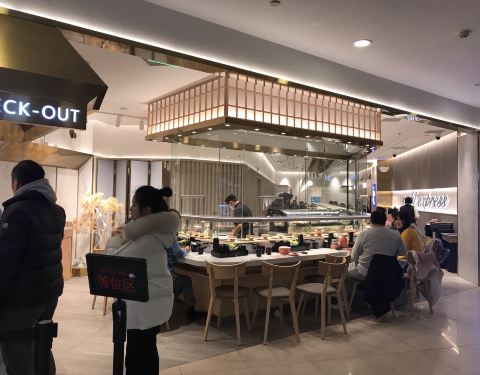 吃饭的时候传送带在额头顶上方输送餐食,看见哪个有兴趣就可以随手取下来,根据不同的颜色买单,这样的吃法是不是很新奇和有趣呢?
