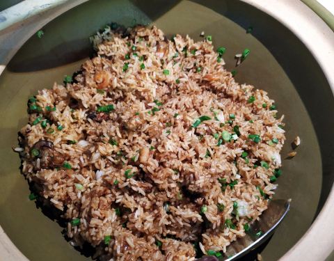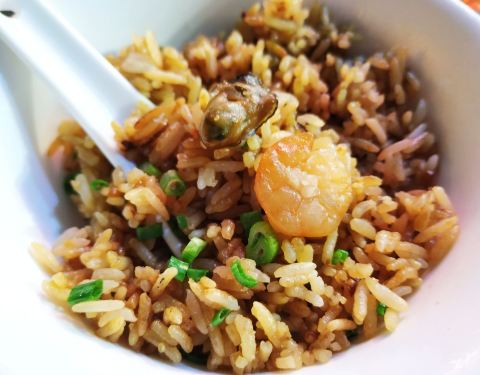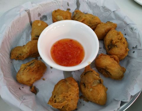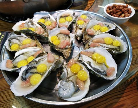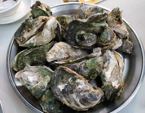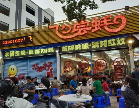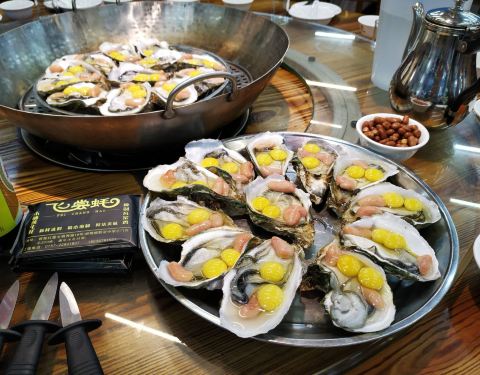 [2019-05-03]我们在顺德游玩,将近晚餐时间,就导航去这家“飞尝蚝”,因为亲戚听到他朋友的介绍,说这里吃蚝不错,于是我们就来试试了。来到店门前,在路上窄窄的划线停车位上把车停车,刚刚好剩下最后一个车位,我们庆幸来得还算及时,要不然比较难找停车位了。看到门外的露天桌子已经坐了不少的客人,亲戚们走进大厅去找位,被告知大厅已经全被订了座,只能走回到门外的露天位。那种木桌面、中间有煤气炉的桌子已经全坐满了人,服务员拿了两张塑胶圆桌拼起来给我们。看到附近的客人都点了那种木桶蒸蚝(大大的圆形铁锅,上面盖个很大的木桶作为锅盖),我问服务员,我们坐这种桌子,是不是就不能点那种蒸蚝了,服务员答道,蒸好了再端上来给你们。亲戚们走到大厅里点菜了,点了6个菜和一个焗饭。(1)蒸大蚝,一打108元,端上来后,我们发现蚝的上壳还未开的,服务员给我们一把小刀,让我们自己开蚝。蚝肉挺鲜甜的,里面的汁水也很鲜美。我们看到附近桌的蚝都是有小小鹌鹑蛋的,而我们的没有,打开就只是蚝肉,问了服务员才知道,原来那种是不同的,她告诉我们下次来,要指明点那种188元的,才是有鹌鹑蛋和鸡子的,亲戚们倒是觉得幸好没点那种,因为大家都说不吃鸡子的,哈,我们想着下次能否点个只加鹌鹑蛋的生蚝。不过看着别人桌上的“鸡子+生蚝+鹌鹑蛋”的色泽真的很漂亮,我也忍不住跑去拍人家桌上的菜了,那时大厅里订了桌的,人还没到,漂亮的“鸡子十生蚝十鹌鹑蛋”已备好了在桌面上。(2)三水冬瓜鱼头汤,38元,好大的一盘汤,冬瓜挺甜的,鱼头也很鲜美,大家都爱这个汤。(3)酱爆豆角,30元。豆角挺爽脆,不错。(4)酥炸生蚝,68元,外胸内嫩,肉汁鲜美。(5)山坑鲩鱼,60元。鱼肉好滑,好鲜甜,好好吃。(6)白饭鱼煎蛋,58元。(白饭鱼48元,附算加煎蛋10元)白饭鱼不多,蛋煎得有点老,这个一般般。(7)金牌焗蚝饭,48元。很大个瓦煲端上来,里面的饭不算多,但是瓦煲只是盛器,饭并不是用这个瓦煲来焗出来的,旁边桌的客人也专门来问我们是不是觉得这个不像焗饭,哈,他们说摸着瓦煲发觉煲是冷的。虽然不是原煲的焗饭,不过也挺好味道的,里面很多蚝仔,也有几个大蚝肉,还有虾仁的葱。挺好吃的,大家都吃得很回味。有机会还要再来这里试试其实的菜式,而且下次得提前订座咯。