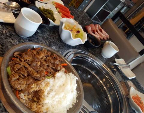 - 几个人对烤肉都没啥兴趣 于是乌冬面啊 拌饭啊 牛肉汤啊点起来 外加个杂菜炒粉丝