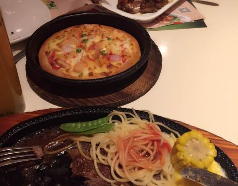 - 东西还好吃,点了牛排,意大利面,披萨,还有鸡米花和饮料,都吃光光了,口味还行,但是没什么特色,...