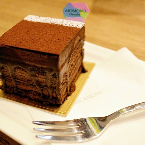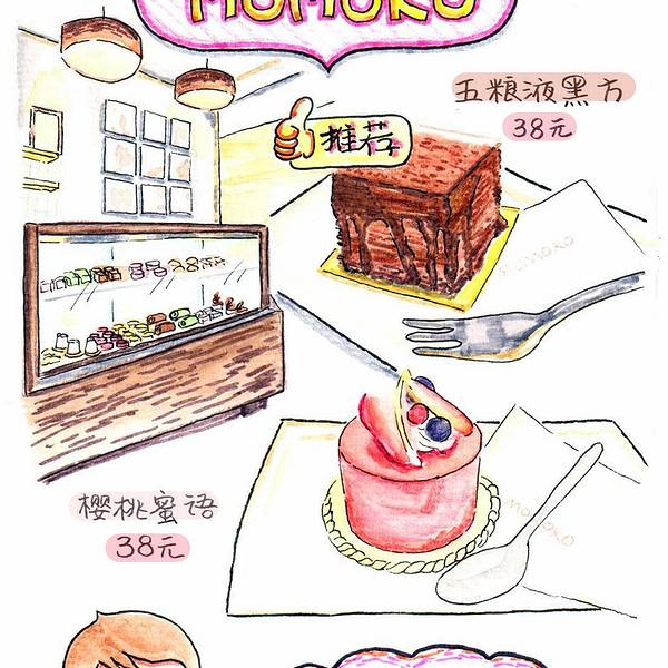 MOMOKO蜜桃家好像最初是以网店来发家的,成了火热网红之后在市中心开了实体店来扩大名气和提高食品安全性。 远洋太古里的这家分店很好找,就在地下一层ole超市的隔壁,电梯下去拐个弯就到了。实体店地方不大,氛...MOMOKO蜜桃家好像最初是以网店来发家的,成了火热网红之后在市中心开了实体店来扩大名气和提高食品安全性。 远洋太古里的这家分店很好找,就在地下一层ole超市的隔壁,电梯下去拐个弯就到了。实体店地方不大,氛围简约干净,小饰品和墙画增加了一些时尚氛围,除了位置过于幽闭没有室外座位外,其他都没什么太大问题。 品种比我想象中的要多,近二十余种甜品基本可以满足绝大部分慕名而来的少女心。特别是新款甜品——蜜桃,做到逼真的外形,远远看过去真心很像一只多汁的水蜜桃,模样真心很美~ 招牌的酒味慕斯蛋糕——五粮酒黑方,口感名不虚传,糅合酒香的甜蜜滋味轻而易举的征服了嗜甜的酒鬼,口感比酒心巧克力更加升华。 这款蛋糕是以黑巧克力蛋糕为基础,蛋糕胚和巧克力酱带来的不是一味的甜腻,而是颇有层次感的各种巧克力差异,最上面那层才是渗入了五粮液的巧克力涂层,外部覆以巧克力薄片和巧克力粉,把酒味儿轻巧的锁在了最上层,保证味蕾的第一时间接触,让我真心喜欢。 另一款樱花慕斯是从日式玄饼中变化而来,增加了口感轻盈的芝士底,口感先是清爽后是甜腻,相对来说比其他款甜度要低一点,当然对我来说还是太甜腻了点——可惜无奈这儿的甜品款总体都是偏甜口感。 咖啡一般般,属于喝完就毫无印象的那种,门口的冰淇淋柜台让人颇有吸引力,甚至还有浓度到达120[%]的信长冰淇淋球,号称是宇宙最强浓度,非等闲之人难以销售~