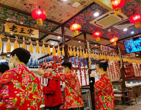 全家去这家吃东北菜,之前看过不少评论,也就体验下图个新鲜。 【环境】 餐厅不是很大,格局有点拥挤。 但布置的元素很东北,大红大绿的。 【服务】 工作人员很热情,都是以亲戚称呼客人。 还有表演,特色很东北。 【口味】 菜品,说实话,没撒吃的,选择很少。 基本点一个大铁锅后,选择配菜加入,味道还可以吧。