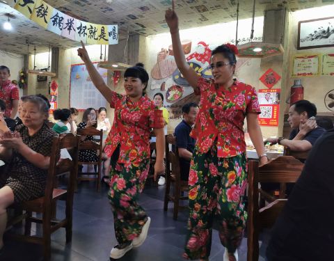 中秋节预定了这家聚餐~ [服务]服务绝对给满分,工作人员各个热情饱满,声音洪亮,不管是接待还是一般服务都很热情,全程走着“大舅妈”、“大舅”风~ 而且工作人员都身怀绝技,会跳舞能唱歌还有东北二人转~ 不仅有4秒喝啤酒,还有倒立喝啤酒,简直是在用生命在工作啊~ [环境]室内环境不是很大,格局有点拥挤,布置老有东北味了~ 菜品选择不多,特色|铁锅炖大鹅^,味道还不错~ 加了蔬菜|豆角^和白菜,入锅煮后不是很入味~ 经典|玉米饼^,2元/个,很好吃,有点催,推荐~ 饮品|東北野山楂汁^味道还不错~