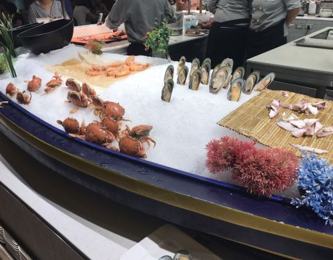 人气很高的自助餐, 菜品种类很多,各色海鲜、肉类,还有精致的甜点,令人应接不暇