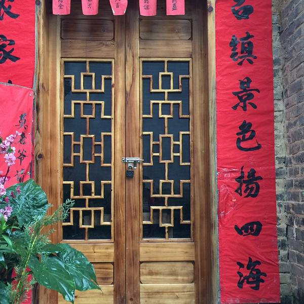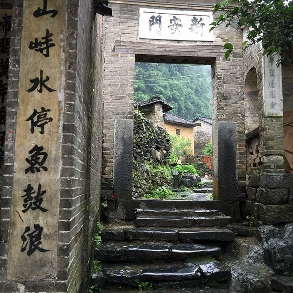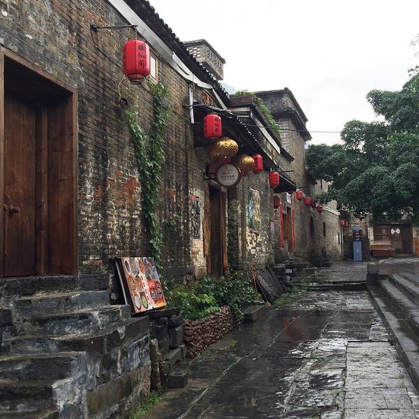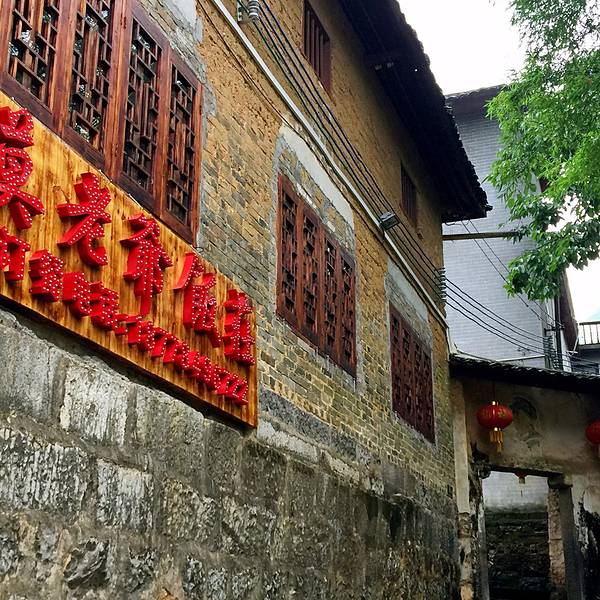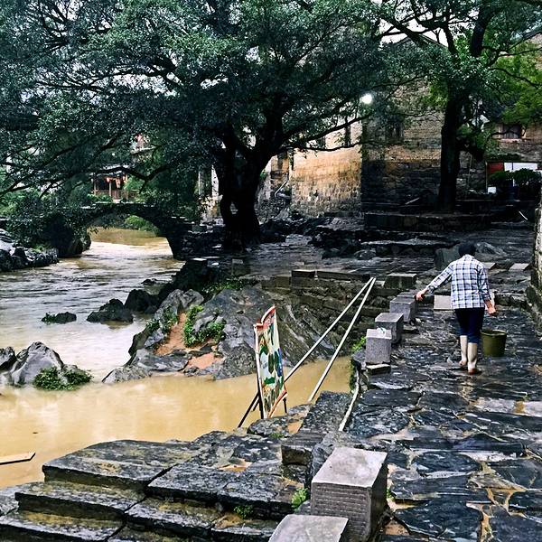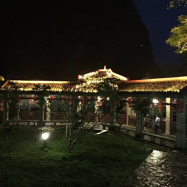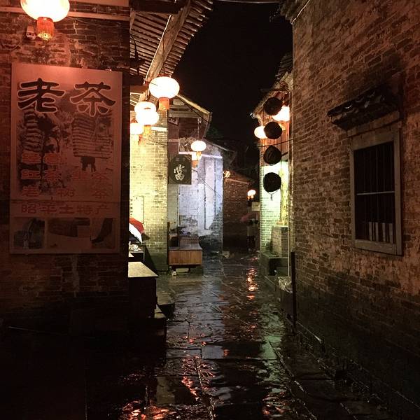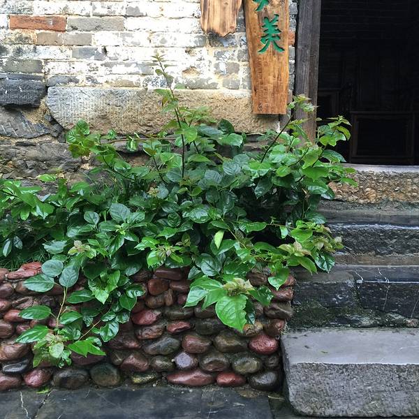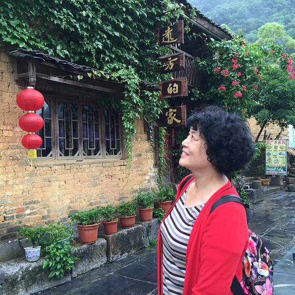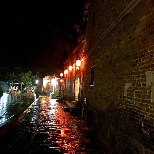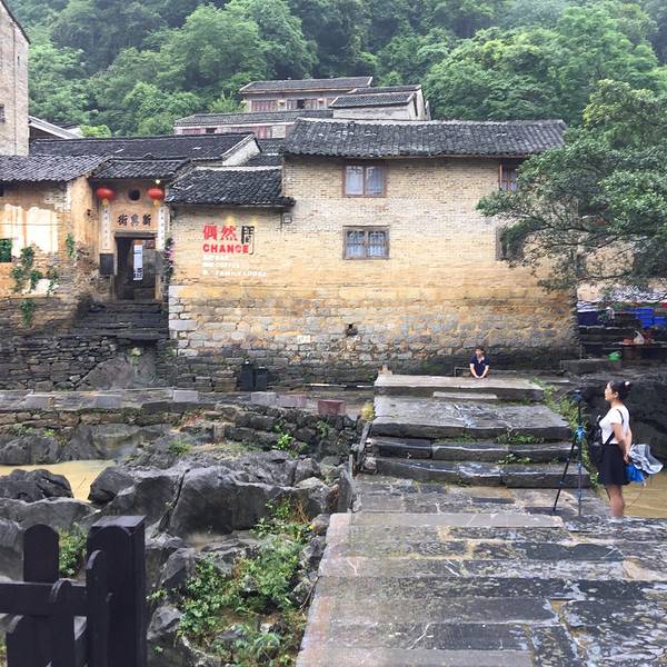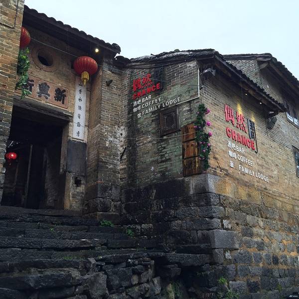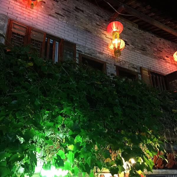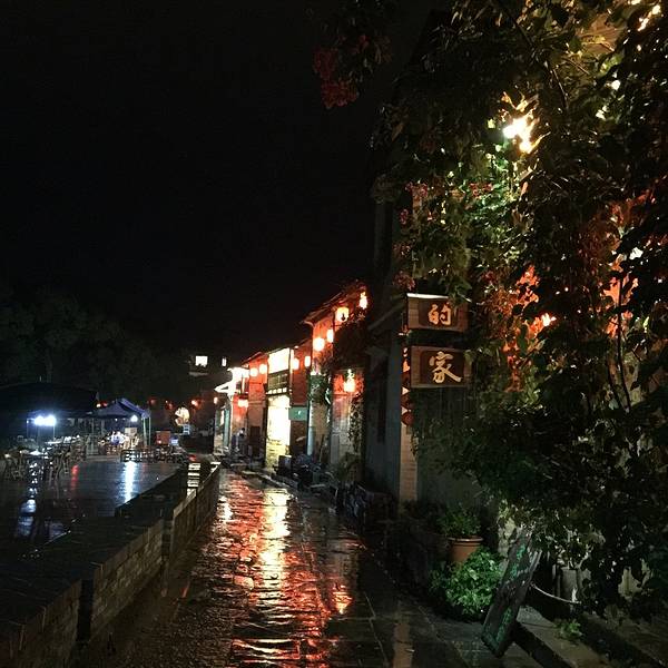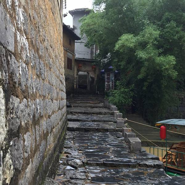 过了带龙桥继续上几级台阶就到了“莫老爷饭馆”,早已是饥肠辘辘快点填饱肚子吧,这时饭馆里的人不多要了一份豆豉蒸鱼和炒地瓜秧饱餐了一碗米饭,身体有力气了。(幸亏这时把饭吃了,掌灯时分这里已经是座无虚席了。) 再往前走了几步就到了我今晚要住的客栈——泊客,在这里会到了大巴车一起来的广州婷婷(小美眉机灵的很别看只有20几岁,单身背包客呦,另辟蹊径进的古镇。)婷婷原来订的是大床房,我俩结伴掌柜给我们升级双人间。(掌柜又去大门口给我取行李,并打电话联系好明天到桂林的班车,小美眉下午回贺州乘高铁回广州。)和婷婷在房间里自拍了一张照片。天黑了,小雨还在时不时的滴答着,我们一起去看古镇的夜景,这里的夜很静,店铺的门依然开着,红红的灯笼挂在大门上,这里没有歌厅,没有丽江、凤凰、那样的喧闹,只听见小雨拍打雨伞的答答声,还有鞋子踩在积水里啪叽声,遁着灯光我们漫无目的的走着,这里瞅瞅那里看看拍拍照片挺有意思的。一天的折腾真的很累了,夜里睡的很实,一觉到天亮趴在窗户上看雨不下啦,谢天谢地,刷了牙脸都没有洗蓬头垢面的就跑出去了,唯恐游人又多了起来打破这宁静的早晨。 看!这才是真正的古镇早晨——清新、寂静、忙碌、悠闲.......。晨曦中给我的时间太短了,我匆匆的又重新走过这古镇,在这里经过了下午、傍晚、夜色、和清晨,我还是喜欢这清晨,袅袅的吹烟,流淌的溪水,忙碌的女人,悠闲的游客.......,这些让我回味无穷,我要与你告别了,带着我的行装去奔向下一个地方。
