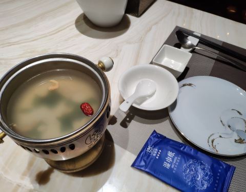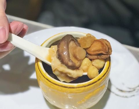一人一盅,里面有鲍鱼海参等,喝起来汤汁浓稠。