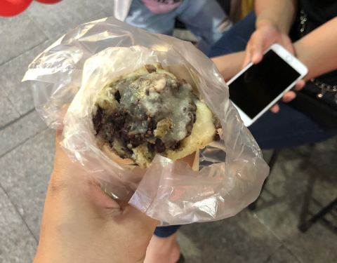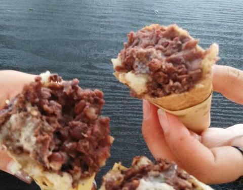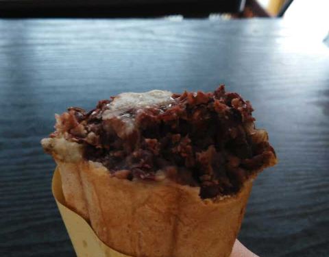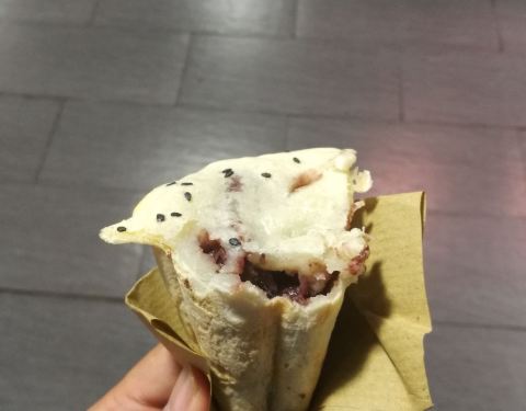看芜湖梅花糕的外形像甜筒,一口咬下香糯的红豆就流出来了,有浓浓的奶香味道,应该是鸡蛋与面粉混合搅拌后形成的蛋液灌倒入模具中。味道不错!