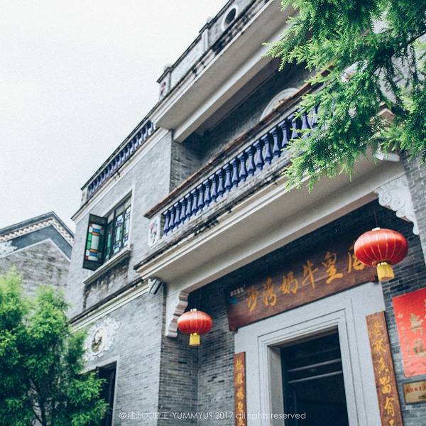 我一向是对景区大肆宣扬的景点没有太好印象的,总觉得都是“充值”出来套路游客的。 来到沙湾古镇后,景区地图里除了留耕堂,何少霞故居等景点,竟还醒目的挂着一家甜品店,那就是大名鼎鼎的牛奶皇后。不过即使初印象不好,这家人气如此高的店也是一定要体验的。一路漫步过来,宏伟的二层独栋小楼映入眼帘,乍一看还以为是音乐馆。进来之后真是人山人海,还有有两层,拨开人群在二楼好不容易找到一个小位置。一看菜单,价格让我大吃一惊——坐落在这样的旅游区的网红店,竟然很便宜。点了一份姜撞奶,一份炼奶龟苓膏,一共只要14块。 我们更喜欢的是这份龟苓膏,炼奶中和掉了龟苓膏的苦腥味,口感嫩滑,格外好。姜撞奶,是这里最闻名的,姜撞奶也叫姜埋奶,是一种广东珠江三角洲地区的特色传统甜点小吃,以姜汁和牛奶为主要原料,可以理解成姜汁味的双皮奶。一口下去,姜汁配上奶味,挂在嗓子上,整个喉咙都是辣辣的姜味,如果平时喜欢生姜味的一定会很喜欢。 完全接受不了生姜的小梦喝了简直疯掉,直呼是黑暗料理,我觉得还算可以接受,但还是万万不推荐不爱生姜的朋友尝试。