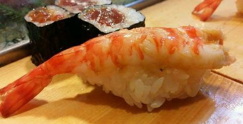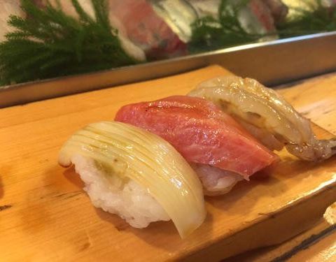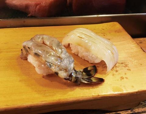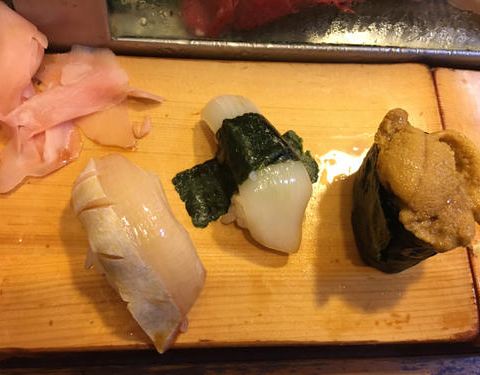 一位师傅负责三四个客人,一个捏好就放到我们各自的餐盘里。店内并无菜单提供,而是主打主厨推荐套餐,鱼、虾、贝类都很新鲜,师傅的手速很快,总觉得让我也不自觉加快了就餐速度。