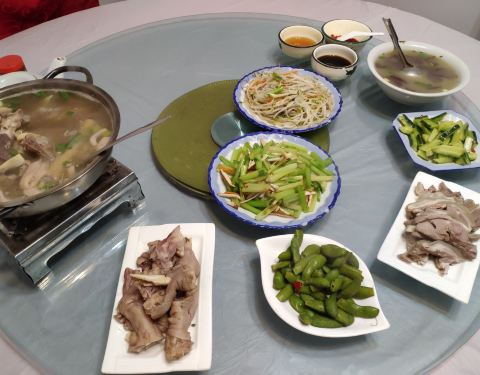 又是一年秋风起,仓前掏羊锅走起~ 早先去仓前掏羊锅,王国强羊锅光顾好几次,热情大方的老板娘给人留下了深刻的好印象,今年又来王国强家了。 热气腾腾的羊杂锅,嗦羊骨髓最鲜美,也爱羊肠,肥肥溜溜的,还有羊肺都是美味。 羊血汤,羊血非常细腻爽嫩,倒笃菜加持,鲜上加鲜。 白切羊肉,鲜,香,酥,赞。 羊脚,爱啃骨头一族的最爱。 四个蔬菜,量大,农家特色。 仓前掏羊锅,推荐王国强羊锅。